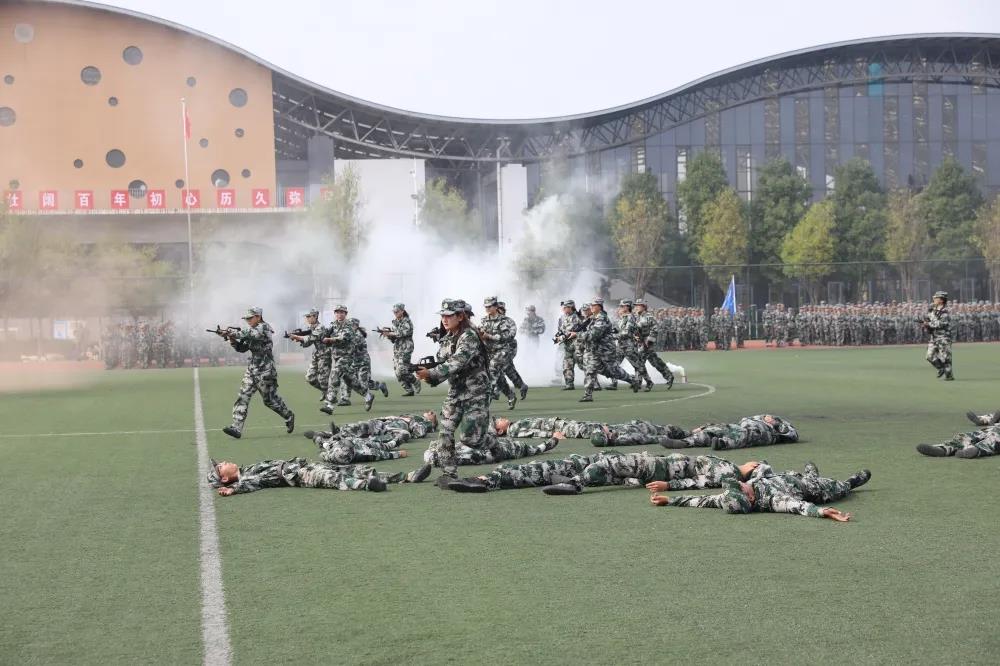 伴随着雄壮的乐曲,7个二级学院4106名新生组成的13个方阵,迈着整齐的步伐喊着嘹亮的口号依次通过主席台接受领导老师的检阅。同学们精神抖擞,英姿飒爽,洋溢着青春朝气与自信。随后的表演方队通过擒敌拳、刺杀操、匕首操、三声三相、战术、战场救护、军歌合唱等项目向领导和老师汇报了军训成果。学院领导为军训先进集体和个人颁奖。