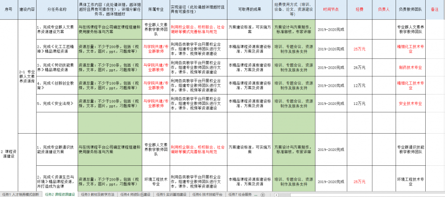建设团队对接国际化标准,凝练专业群特色,认真研究建设目标和建设方案,做到了高标准、高起点、高可行性,提升了“双高”建设的“高度”。在任务书的制订中,细化了建设任务,形成了以年度为单位,涵盖任务名称、实施方式、主要途径、经费支出明细在内的任务清单,总计不少于100个子任务及相应成果,细化了建设任务的“程度”。