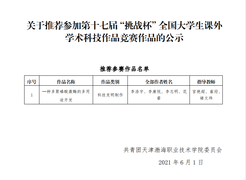 根据第十六届“挑战杯”天津市市赛评选结果及第十七届“挑战杯”国赛章程的有关工作要求,现对推荐参加第十七届“挑战杯”全国大学生课外学术科技作品竞赛的项目信息公示如下。公示期为6月1日至7日。公示期内如有异议,请向学院团委反映。
