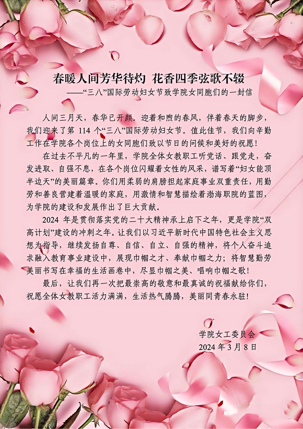 活动以“致学院女同胞们一封信”“一束花手作”“一本书阅读经典”“一张老照片追忆芳华”系列活动为主线,旨在激励广大女教职工践行新思想、建功新时代、展现新作为,弘扬新时代女教职工奋发向上的时代精神,关爱女教职工身心健康,提升女教职工综合素质。