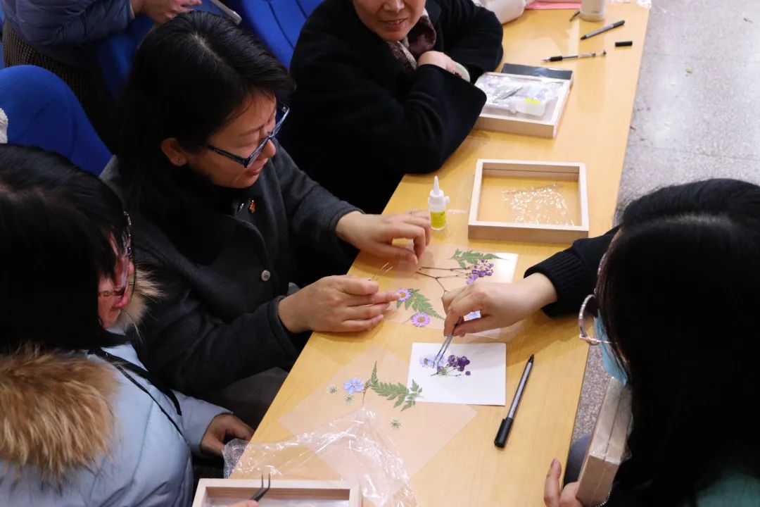 压花手作是以美丽的花材作为创作的基本材料,依其形态、色彩和质感,设计制作成具有观赏性和实用性的植物制品的一门艺术,从花卉的选择、颜色的搭配到实际操作,女教工们通过压花手作体验到了艺术带来的精神享受。