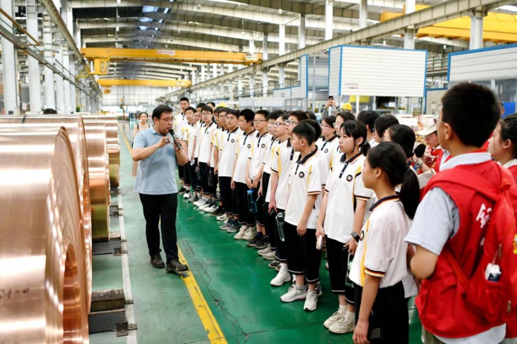 在安徽铜陵,铜陵七中的老师们把思政课搬进制造车间,带领同学们“沉浸式”体验高科技铜产品生产流程,近距离感受中国制造业和家乡铜工业的蓬勃发展历程。