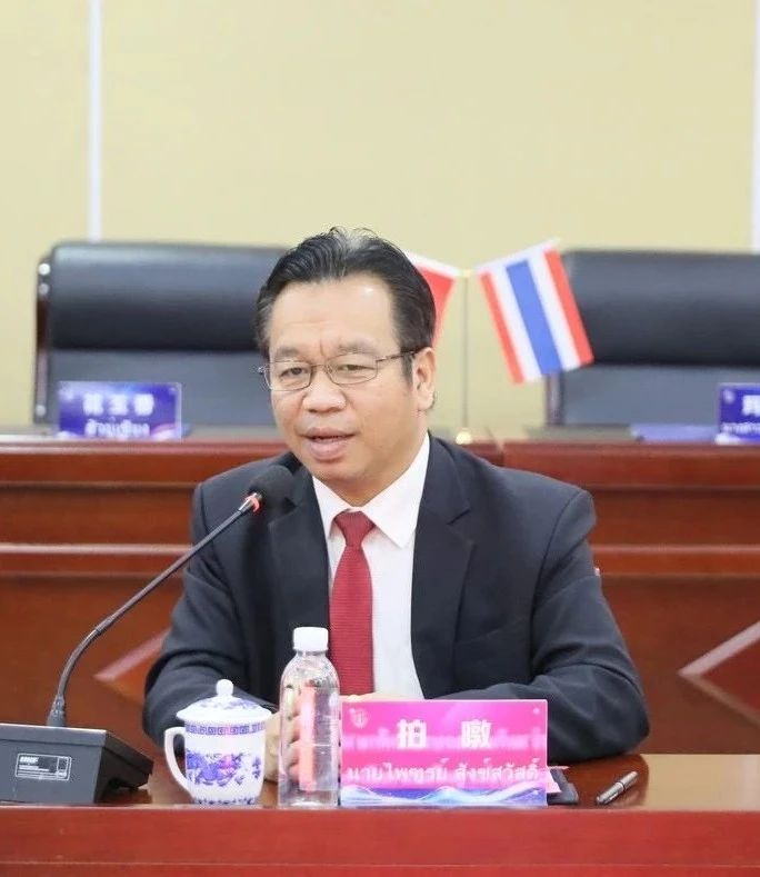 拍暾感谢渤海职院、大城技术学院提供良好的合作平台。他简要介绍了红统技术学院的办学情况,并表示泰国鲁班工坊是中泰职业院校对外合作的典范,期待与两所院校在人才培养等方面进行深入探索与务实合作。此外,他还谈到,本次到访使他切身感受到学院优良的办学条件,希望能为渤海职院做更多宣传,让更多泰国学生来渤海学习。