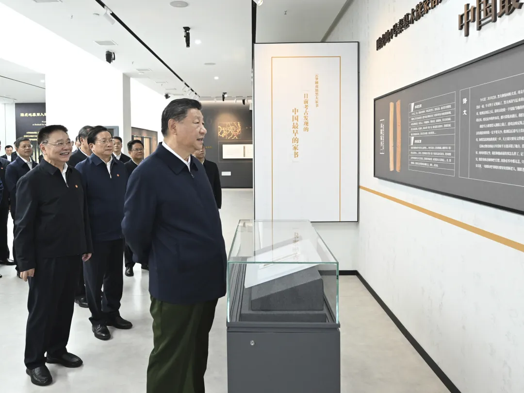 这是4日下午,习近平在孝感市云梦县博物馆参观出土秦汉简牍展。