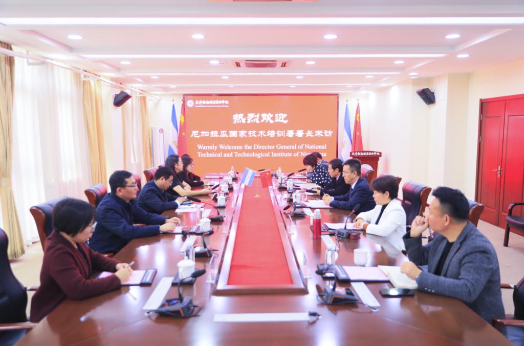 11月20日,尼加拉瓜国家技术培训署署长罗伊达·巴莱达到访学院,并就尼加拉瓜鲁班工坊建设工作开展交流,尼加拉瓜大使秘书刘玉洁、天津职业技术师范大学副校长蔡玉俊等一行陪同。渤化集团副总经理张宝春、学院党委书记魏炳举出席会议,学院党委副书记、工会主席、副院长王蕾主持。