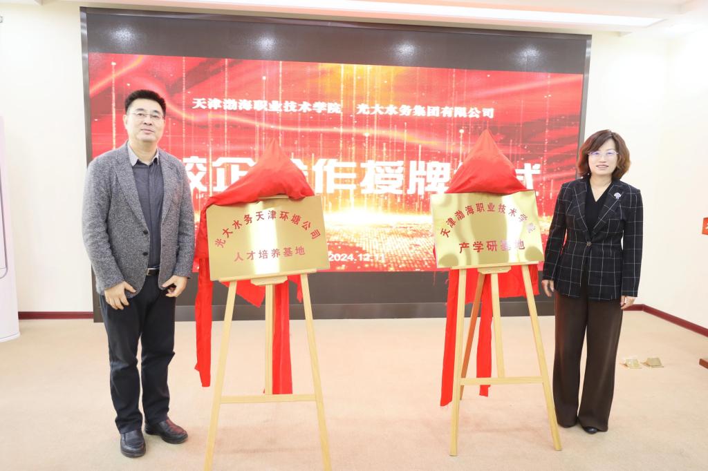 会上,花玉香就学院校企合作现状、相关政策,以及学院发展建设情况进行了介绍,感谢了光大水务集团对学院人才培养工作的支持,并期待双方的合作多出成果和亮点。光大水务天津环塘公司负责人对双方立足新起点开展深度合作寄予高度期望,双方围绕深化校企合作、实践基地建设、人才培养、优势专业治理领域的实践新模式等进行了深入交流。花玉香与刘永代总经理代表双方共同为人才培养基地揭牌。同时,学院在光大水务天津环塘公司建立了产学研基地。随后双方就企业需求、合作的方向及学院专业群建设情况进行了交流。