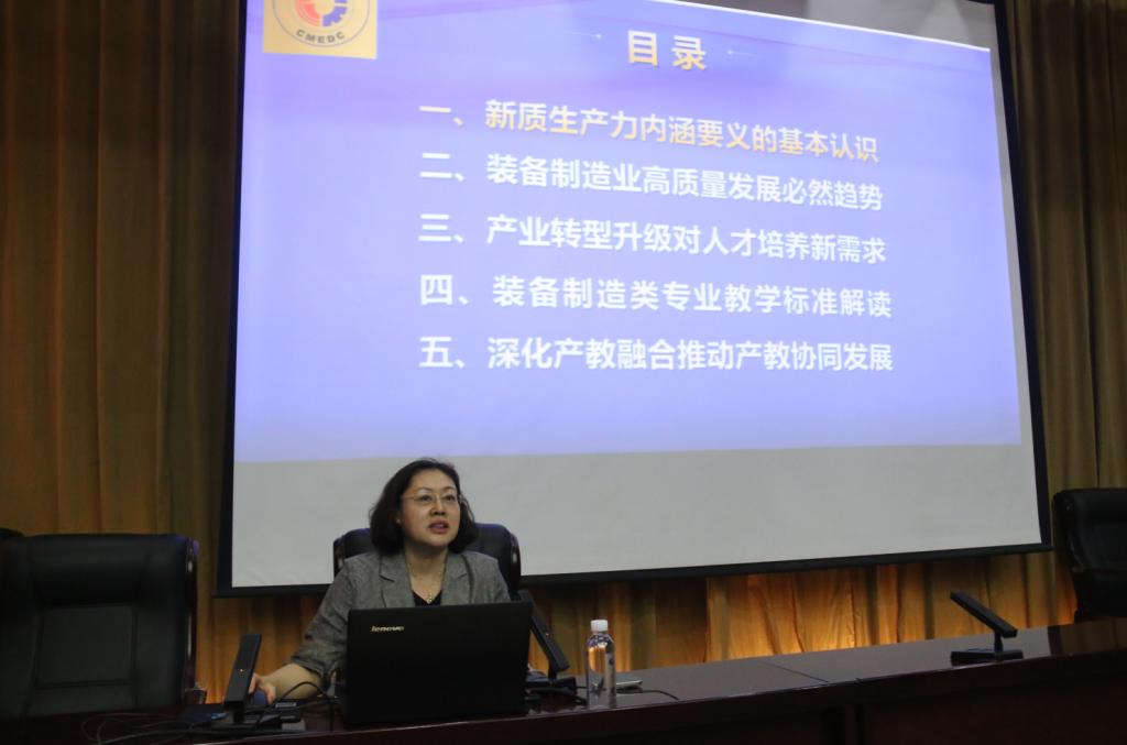 为深化产教融合,全面提升办学治校水平与协同育人质量,赋能职业教育高质量发展,5月16日,学院成功举办"发展新质生产力背景下产教协同育人的思考"专题讲座。机械工业教育发展中心副主任郑丽梅受邀担任主讲嘉宾,带来题为《发展新质生产力背景下产教协同育人的思考——以装备制造业为例》的深度分享。讲座由学院副院长吴国旭主持,各二级学院、教学部中层干部及骨干教师等100余人参与学习交流。