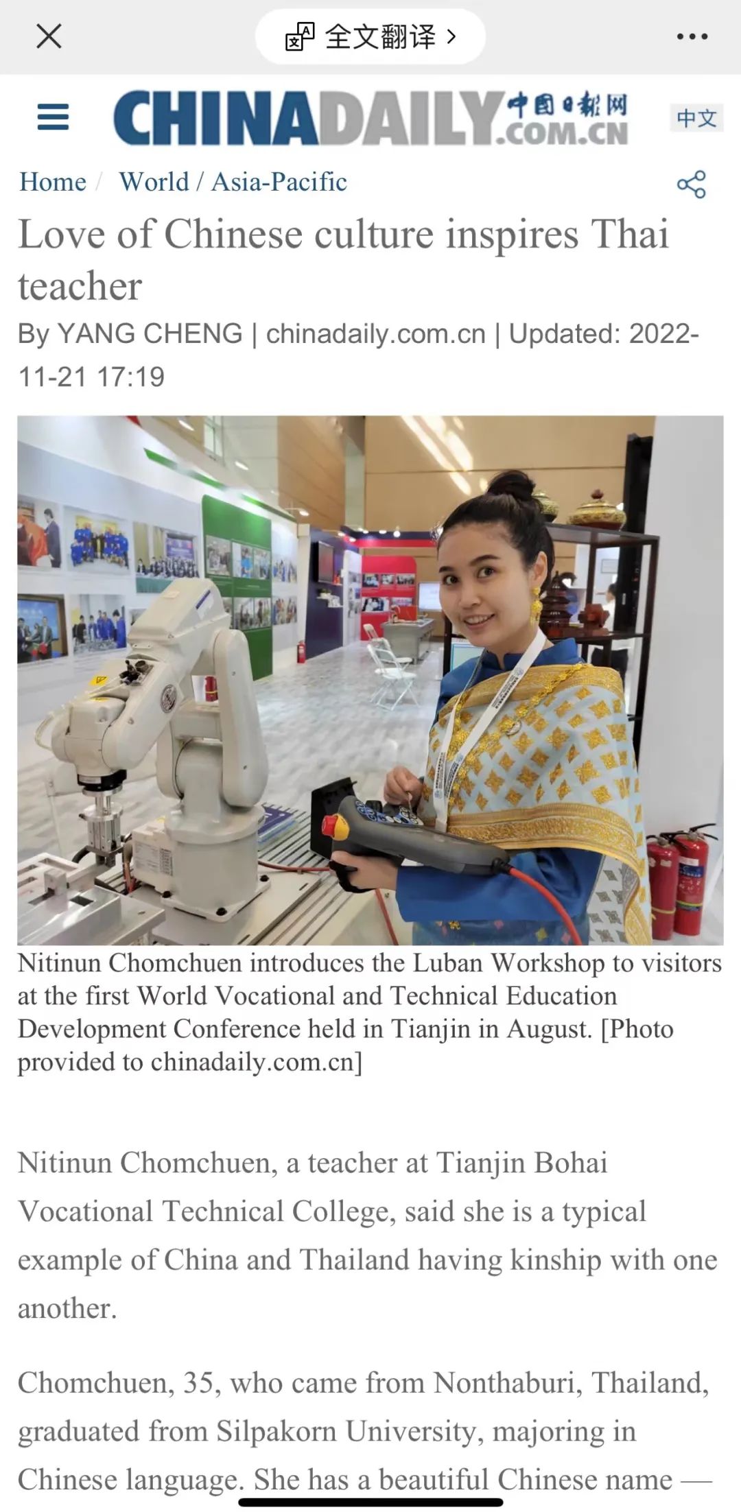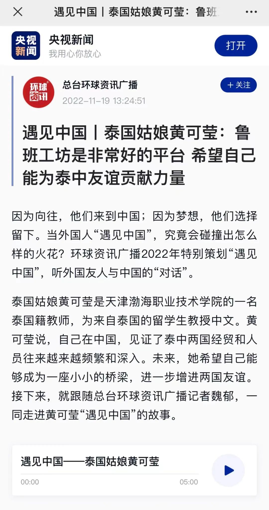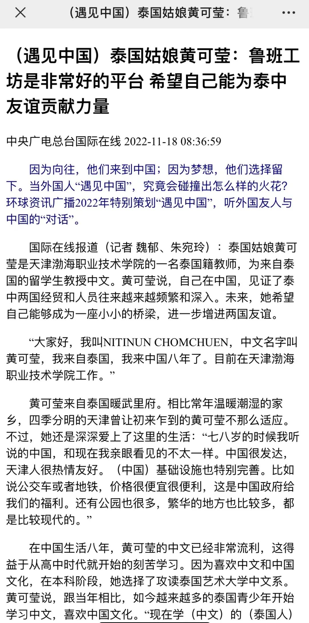 中央广电总台:《泰国姑娘黄可莹:鲁班工坊是非常好的平台 希望自己能为泰中友谊贡献力量》