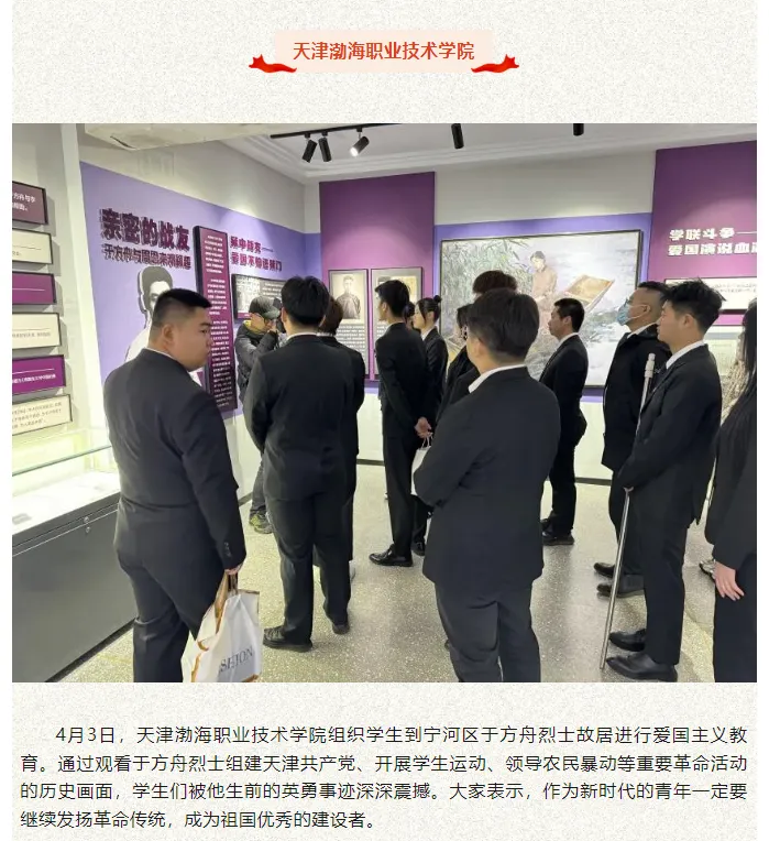 4月4日,《天津教育报》报道学院组织学生骨干前往天津市宁河区于方舟烈士故居开展了“清明祭英烈 厚植爱国情”缅怀于方舟烈士主题教育活动。