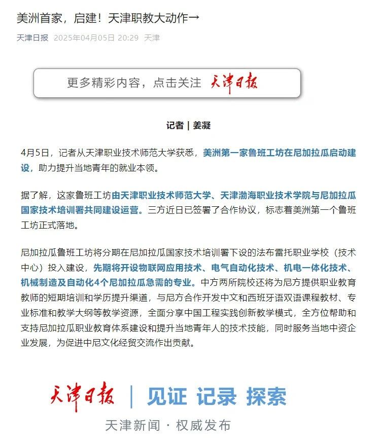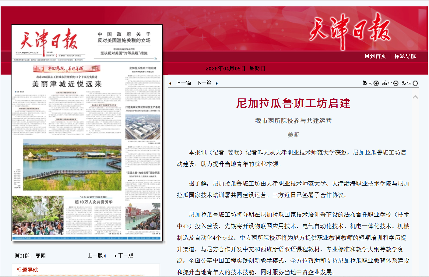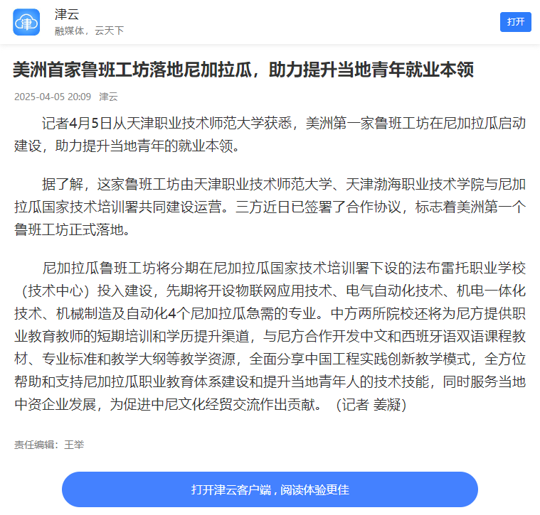 近日,由学院、天津职业技术师范大学与尼加拉瓜国家技术培训署三方共建的美洲首家鲁班工坊在尼加拉瓜首都马那瓜正式启动建设,获新华网、天津日报、津云等权威媒体专题报道。