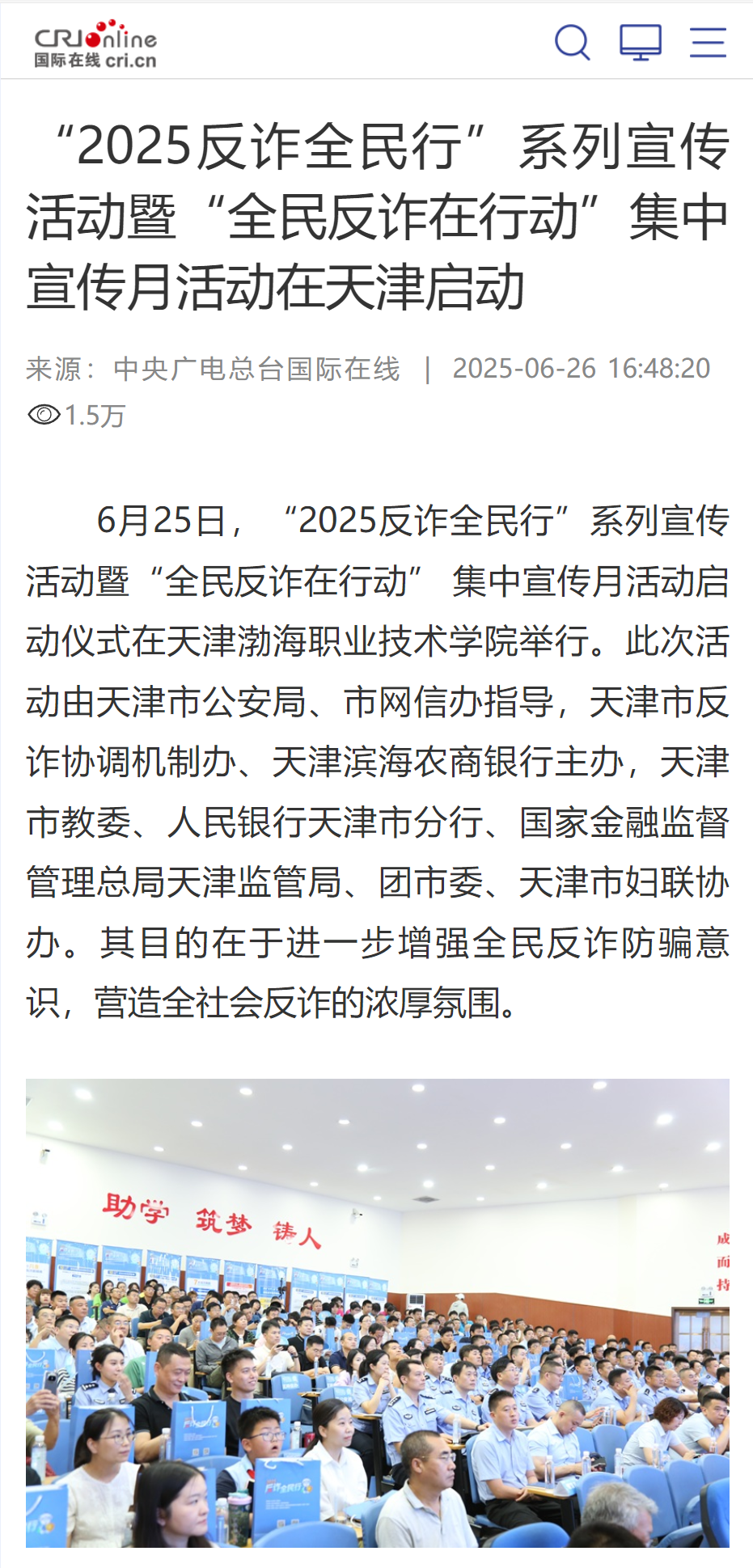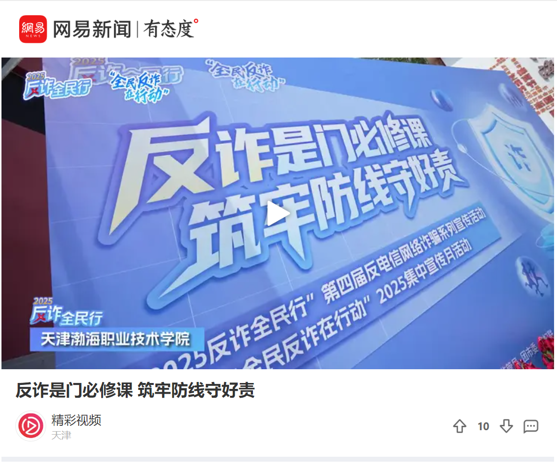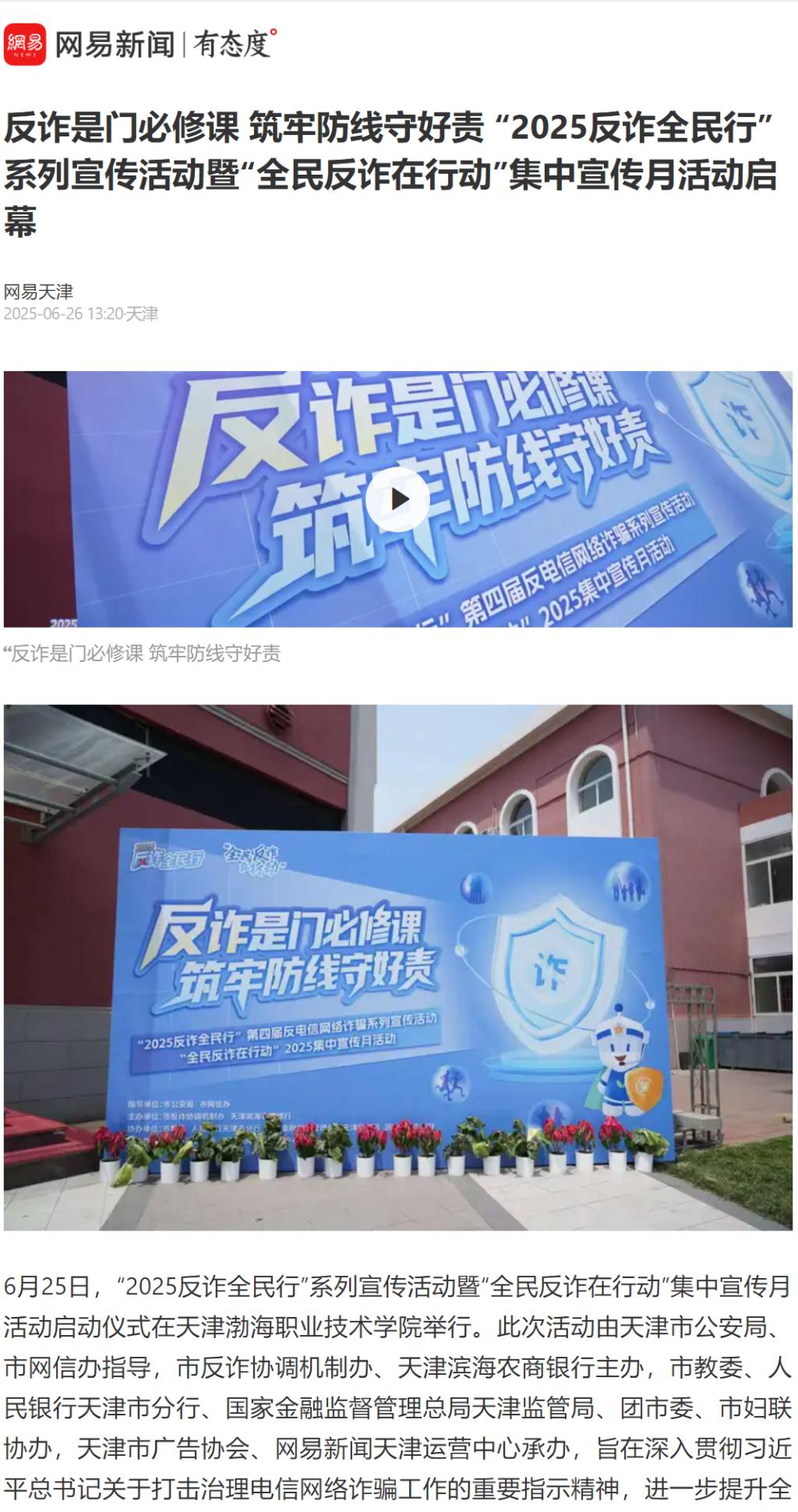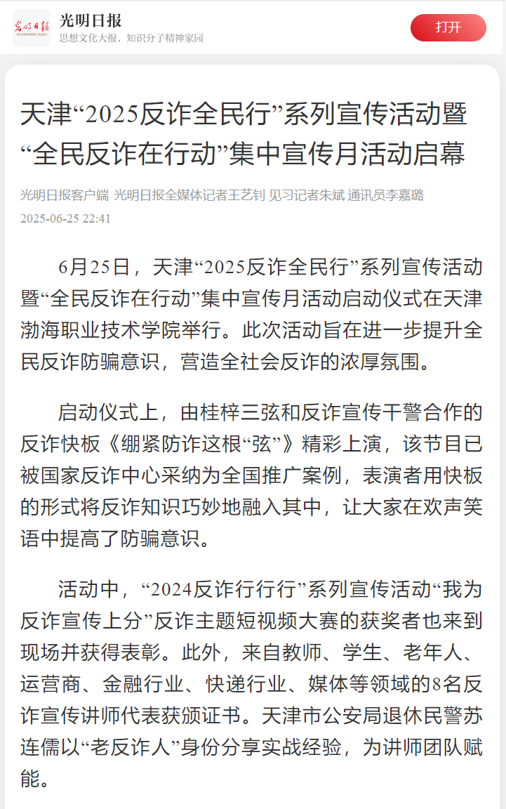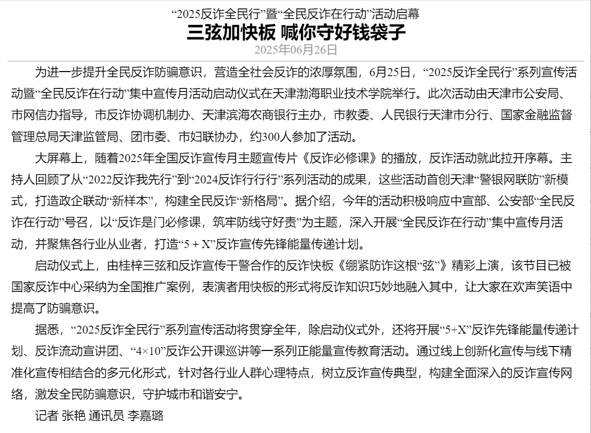 近日,天津“2025反诈全民行”系列宣传活动暨“全民反诈在行动”集中宣传月活动启动仪式在新葡萄奔驰AMG官网举行,获得光明日报、央广网、中国网、法治日报社、网易新闻、腾讯新闻、搜狐新闻、天津日报、今晚报、津云等多家媒体报道。