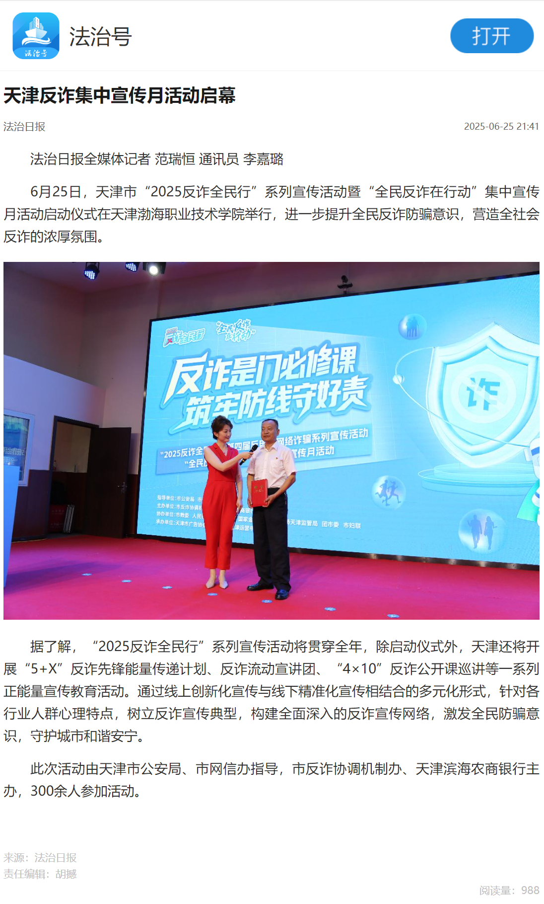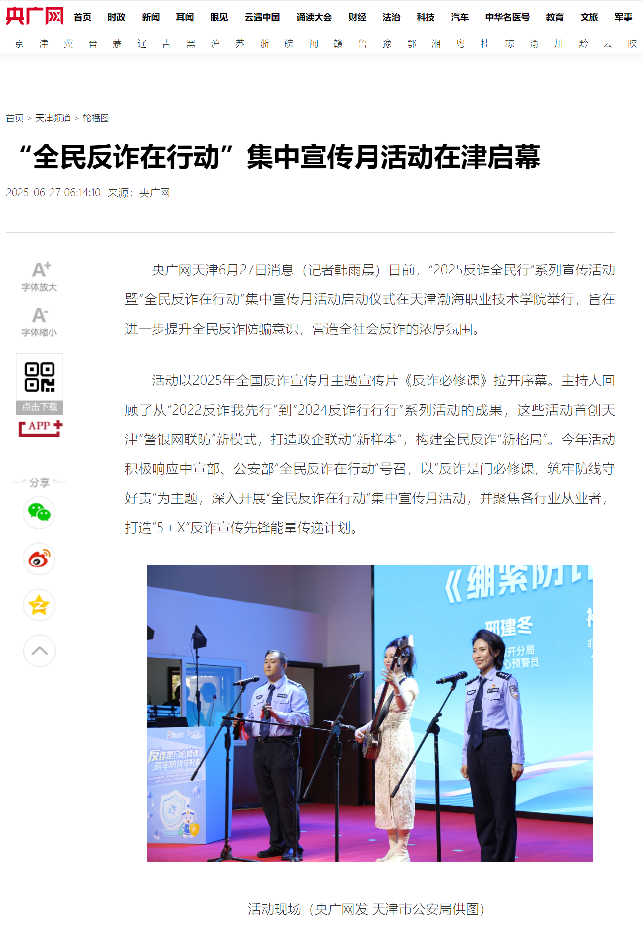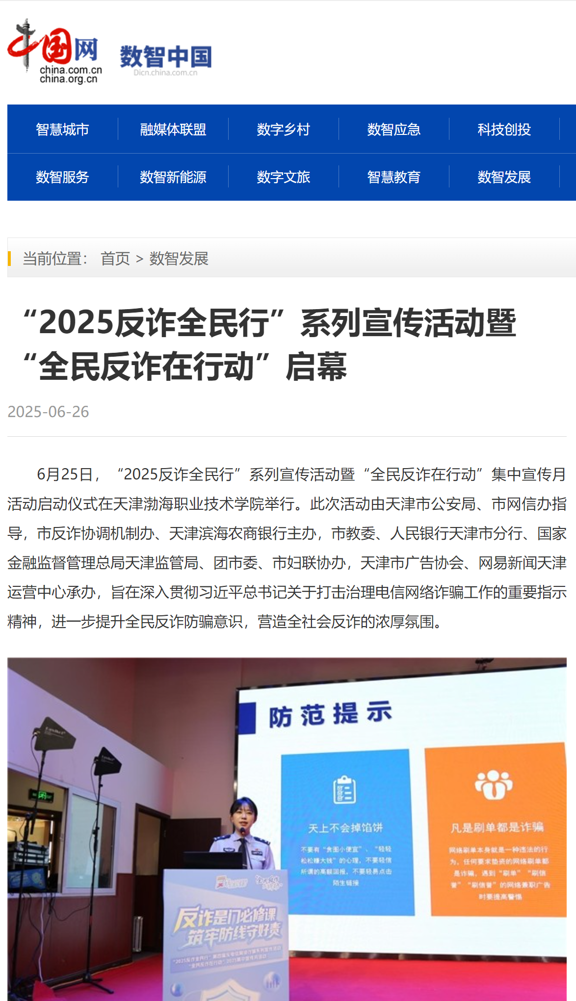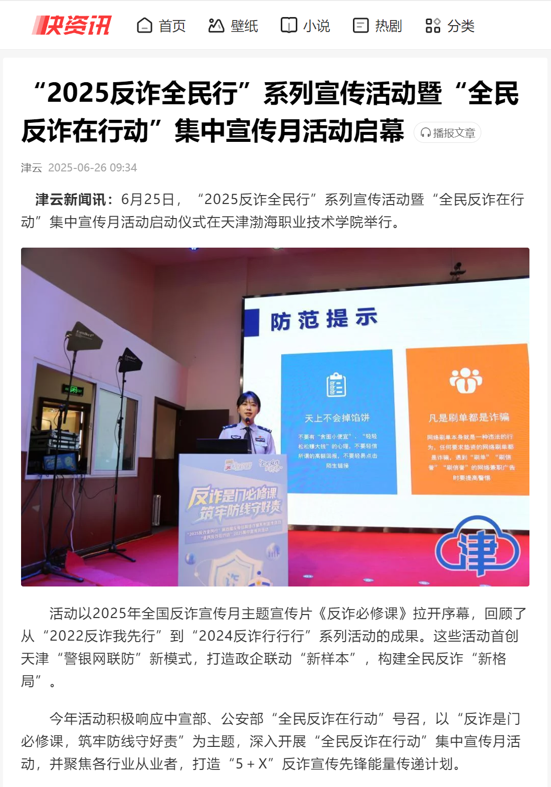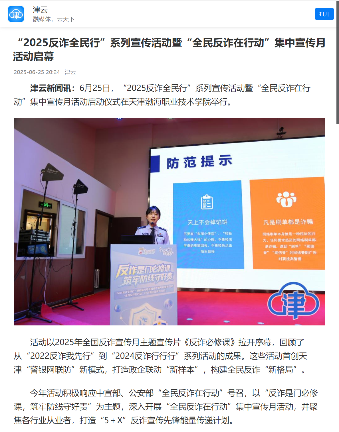 近日,天津“2025反诈全民行”系列宣传活动暨“全民反诈在行动”集中宣传月活动启动仪式在新葡萄奔驰AMG官网举行,获得光明日报、央广网、中国网、法治日报社、网易新闻、腾讯新闻、搜狐新闻、天津日报、今晚报、津云等多家媒体报道。